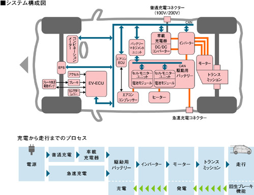 トランスミッションでは、複雑な変速機構を必要としないモーター特性を生かし、変速を1段に固定した軽量・小型のトランスミッションを採用した。車載充電器は、家庭用AC200V/ AC100Vでの充電を可能にする小型・軽量の車載充電器を採用した。